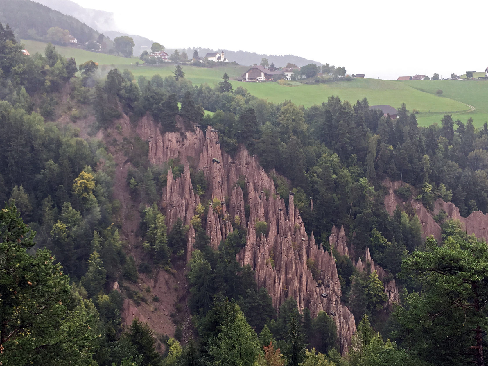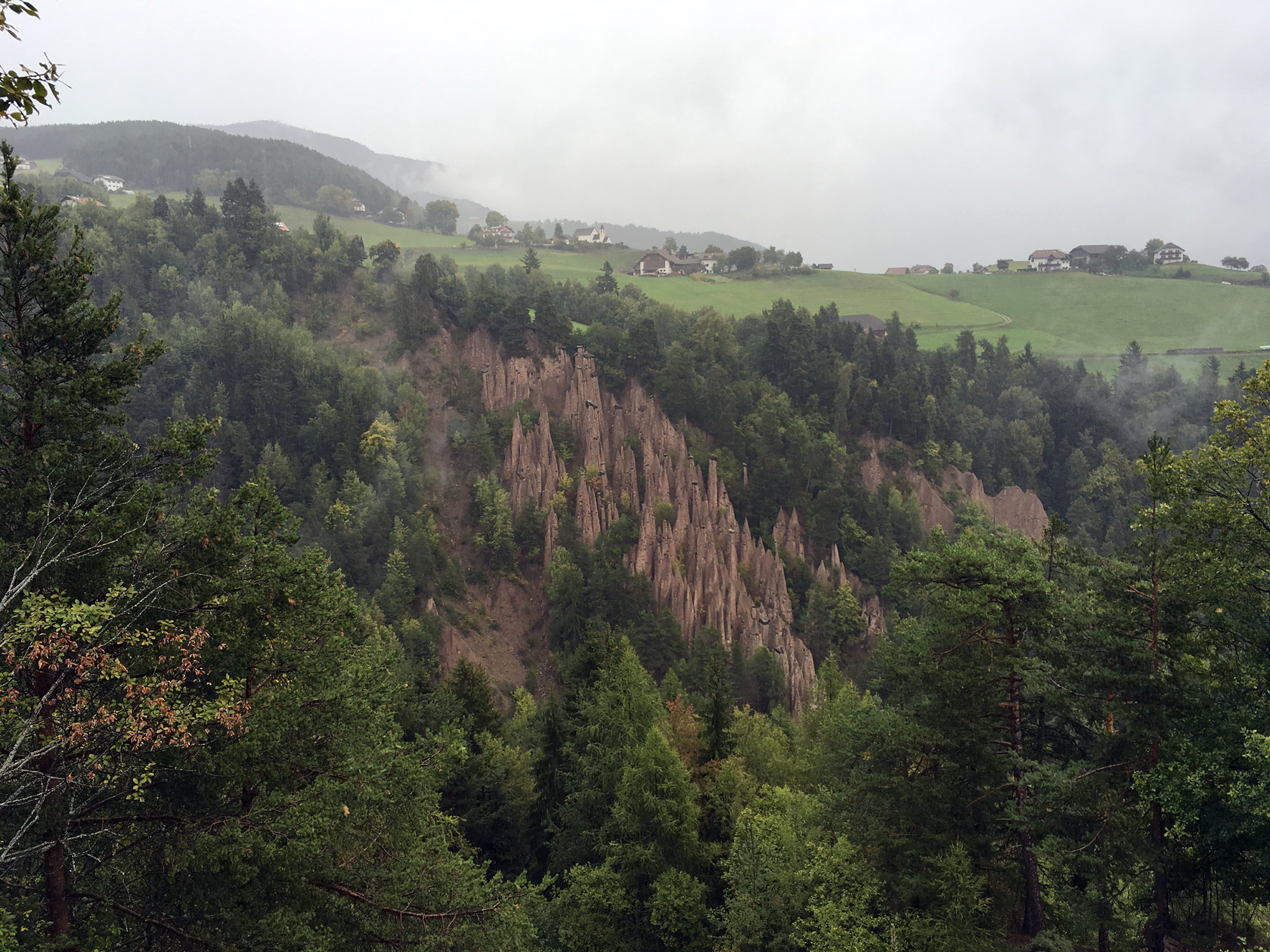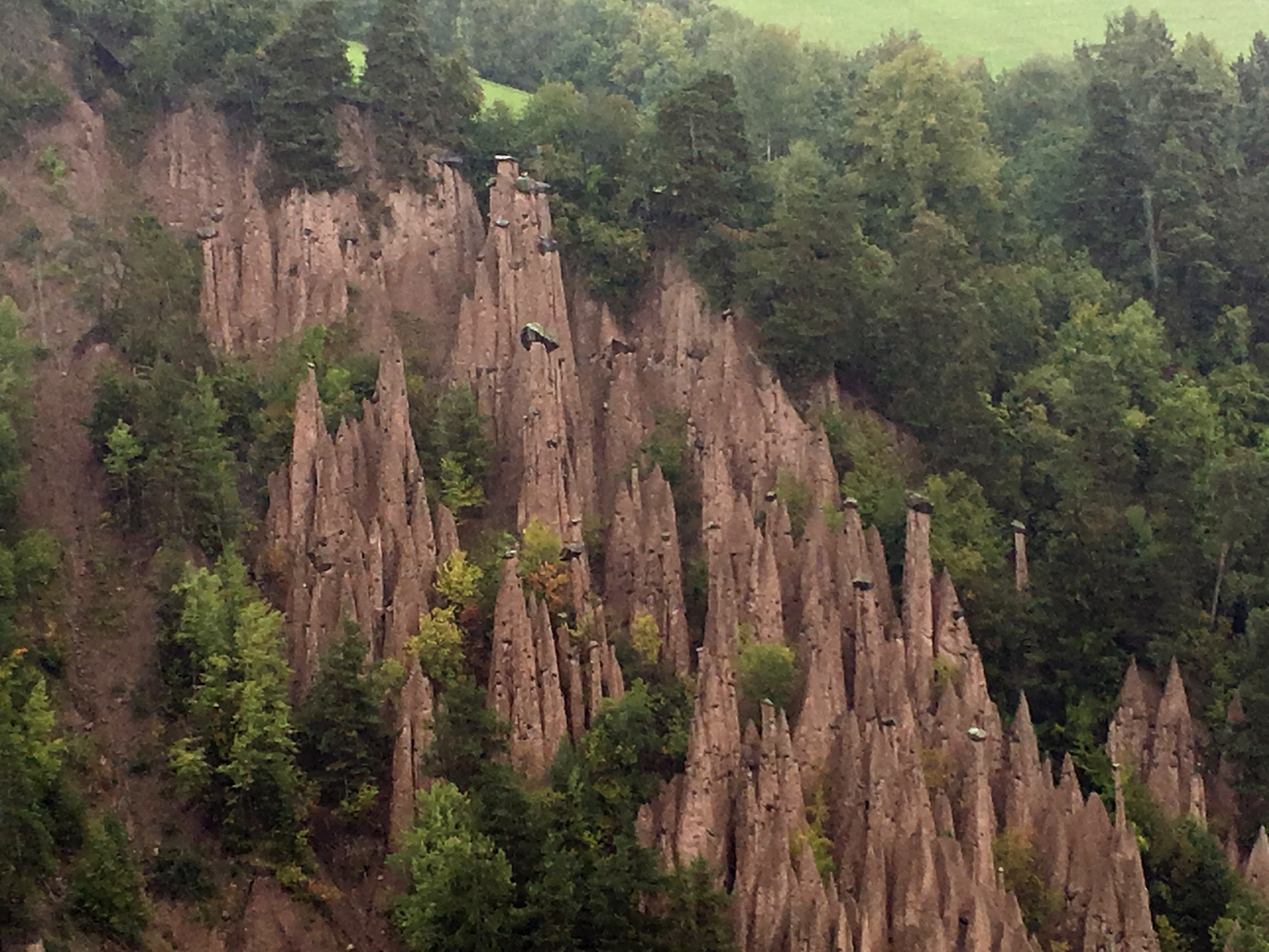 Erdpyramiden gibt es nordöstlich von Bozen eine ganze Menge.Die Auflösung am iPhone war bei dem regnerischen Wetter sehr bescheiden.Die Steine obendrauf schützen das darunterliegende Material vor der Erosion. Fällt der Stein runter, geht es rasch und die einzelne Pyramide verschiedenen nach einiger Zeit.