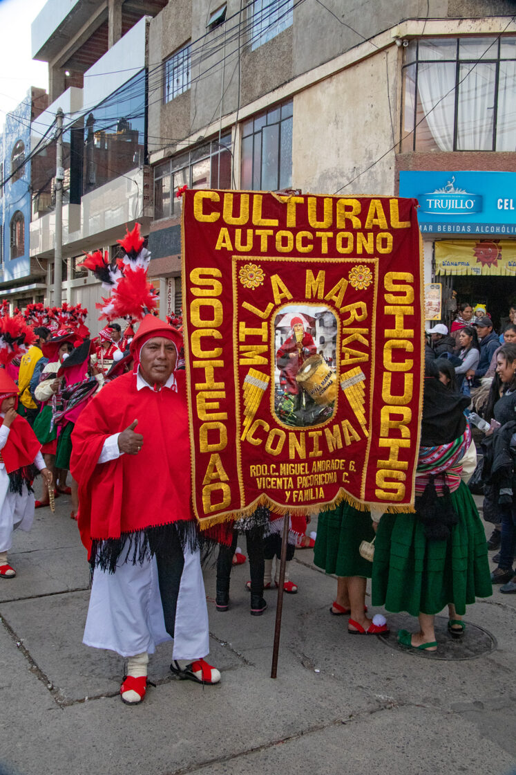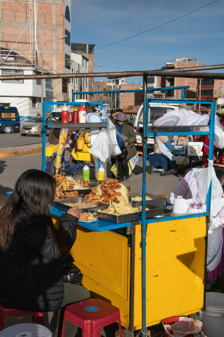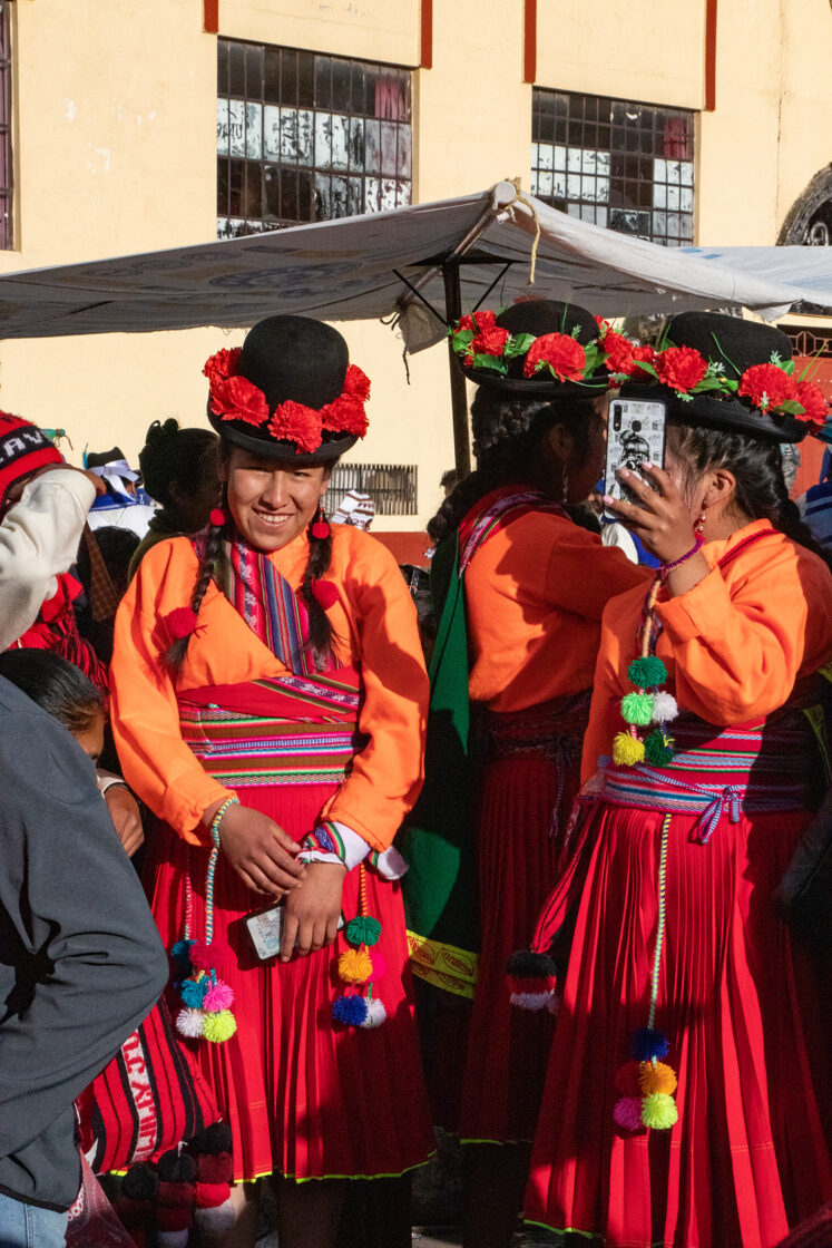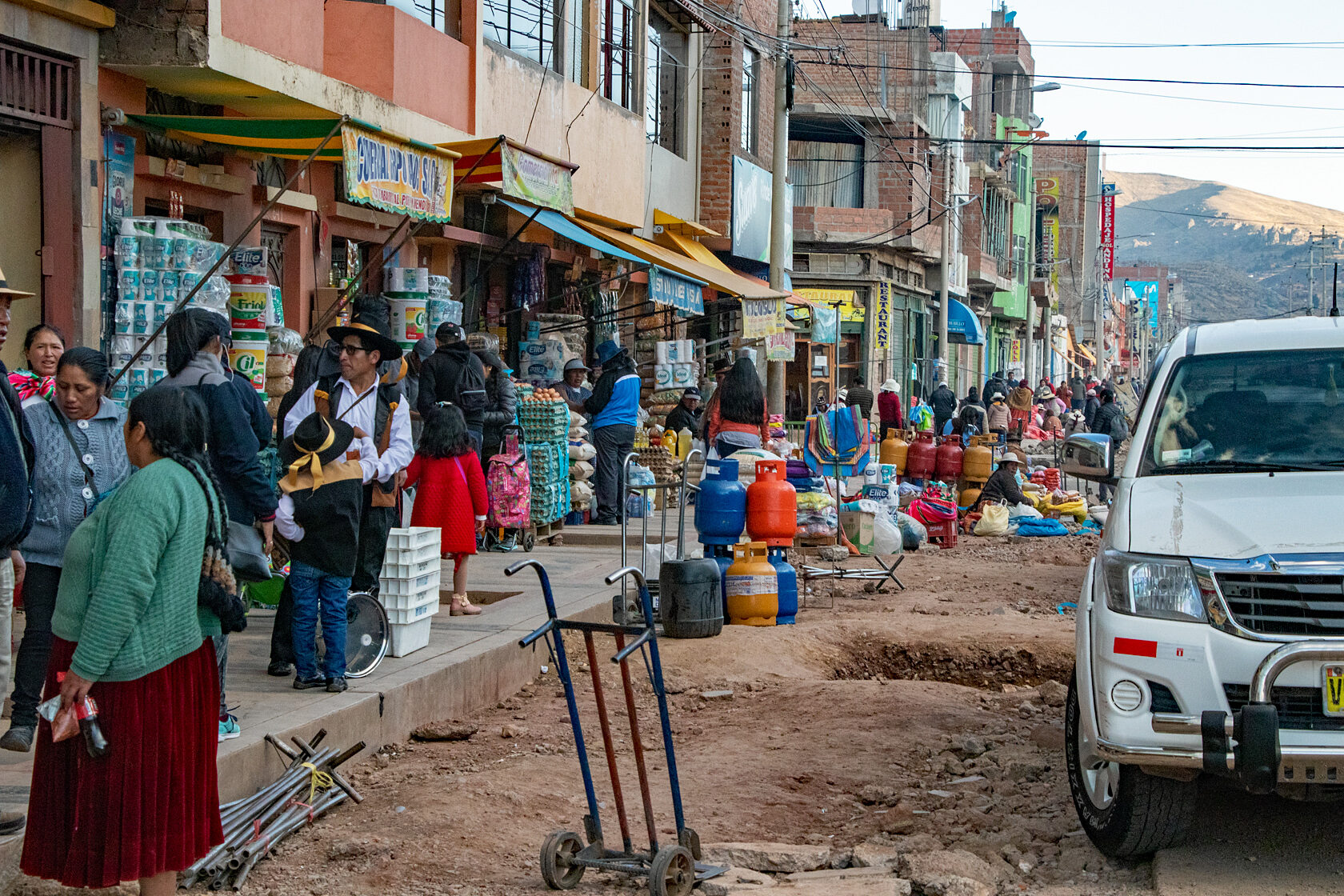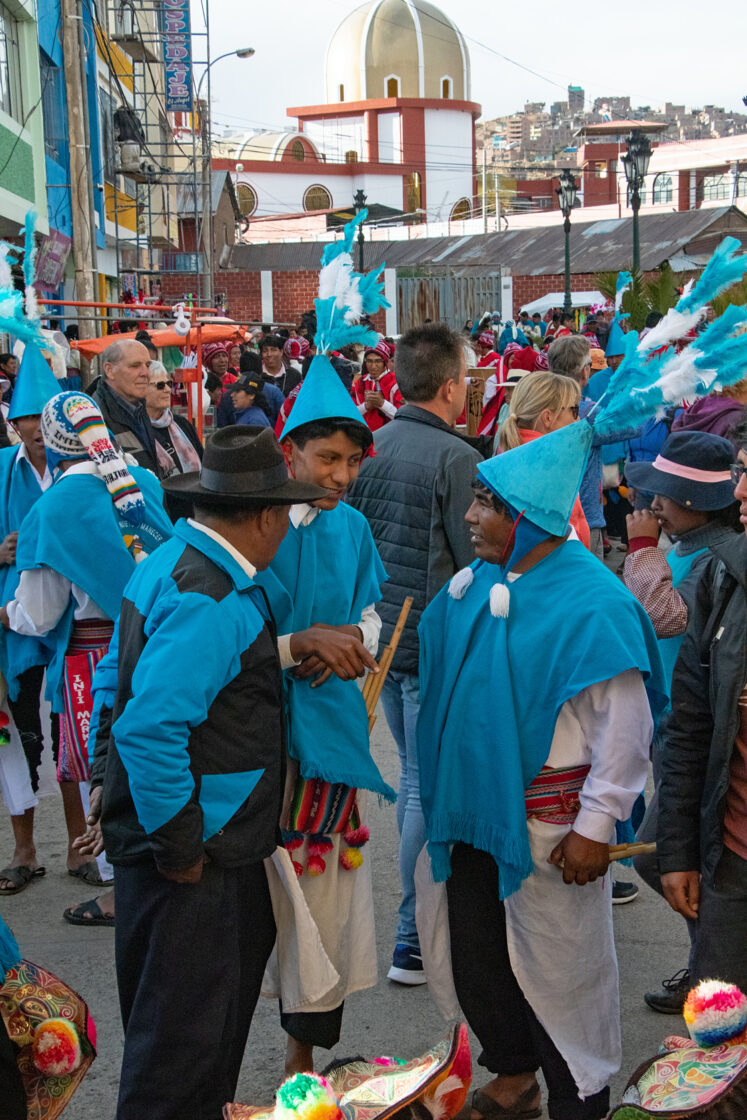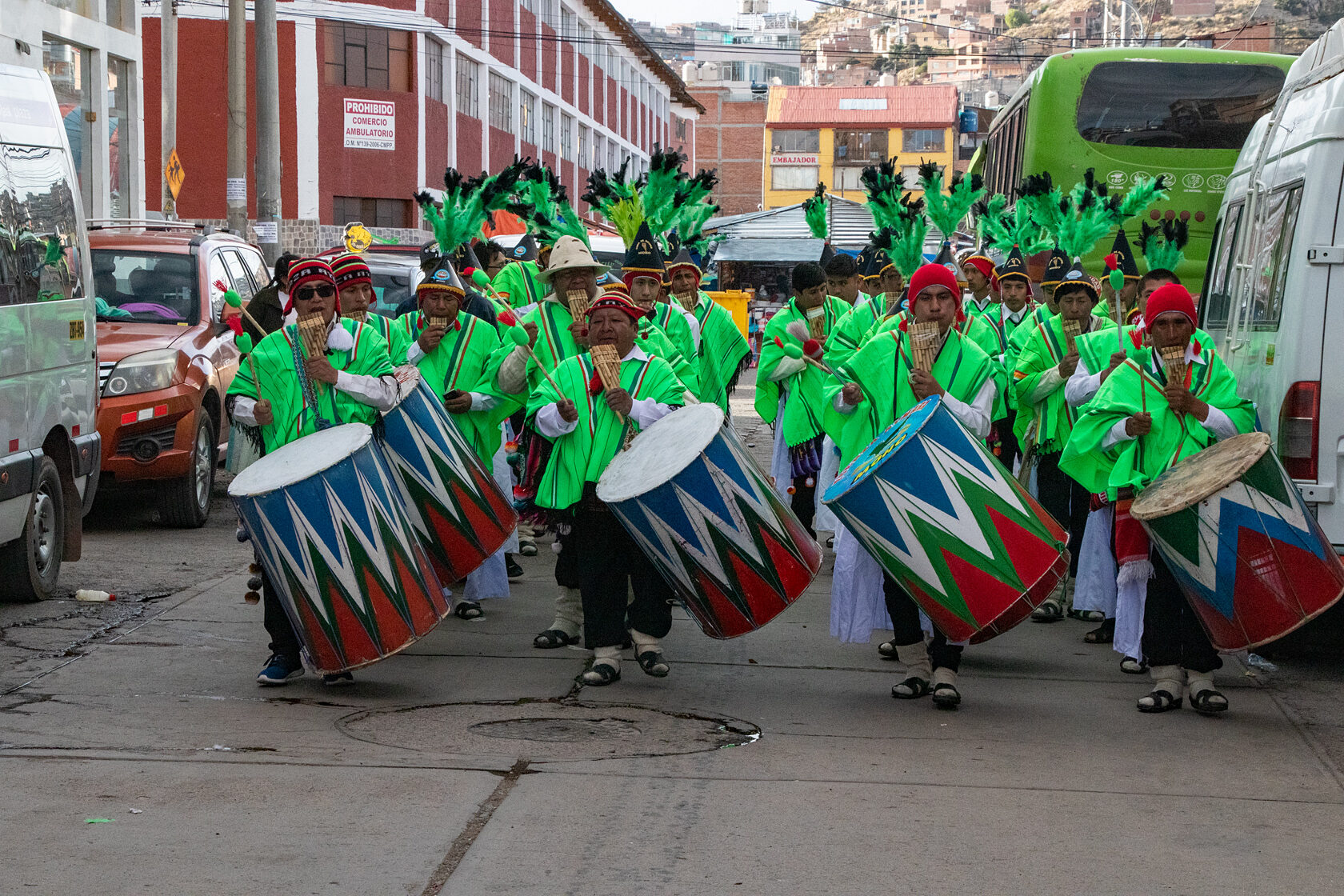 Lange Fahrt von Chivay (Colca Tal) nach Puno am Titicaca See, mit einigen Stopps. In Puno findet ein ausgelassenes Fest mit viel Musik, Essen und Alkohol, inkl. stark Betrunkenen die irgendwo rumliegen (Männer und Frauen) ,statt.