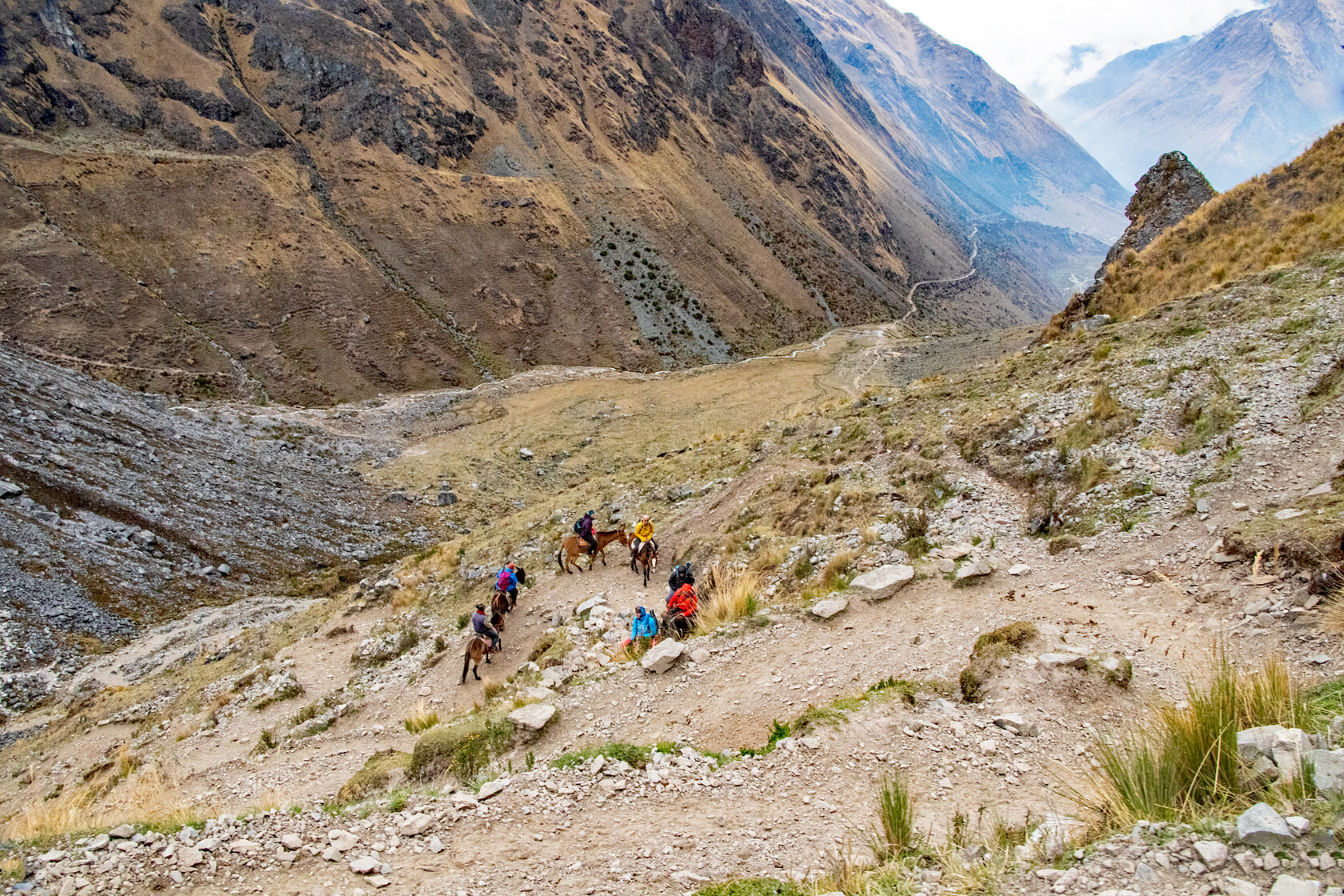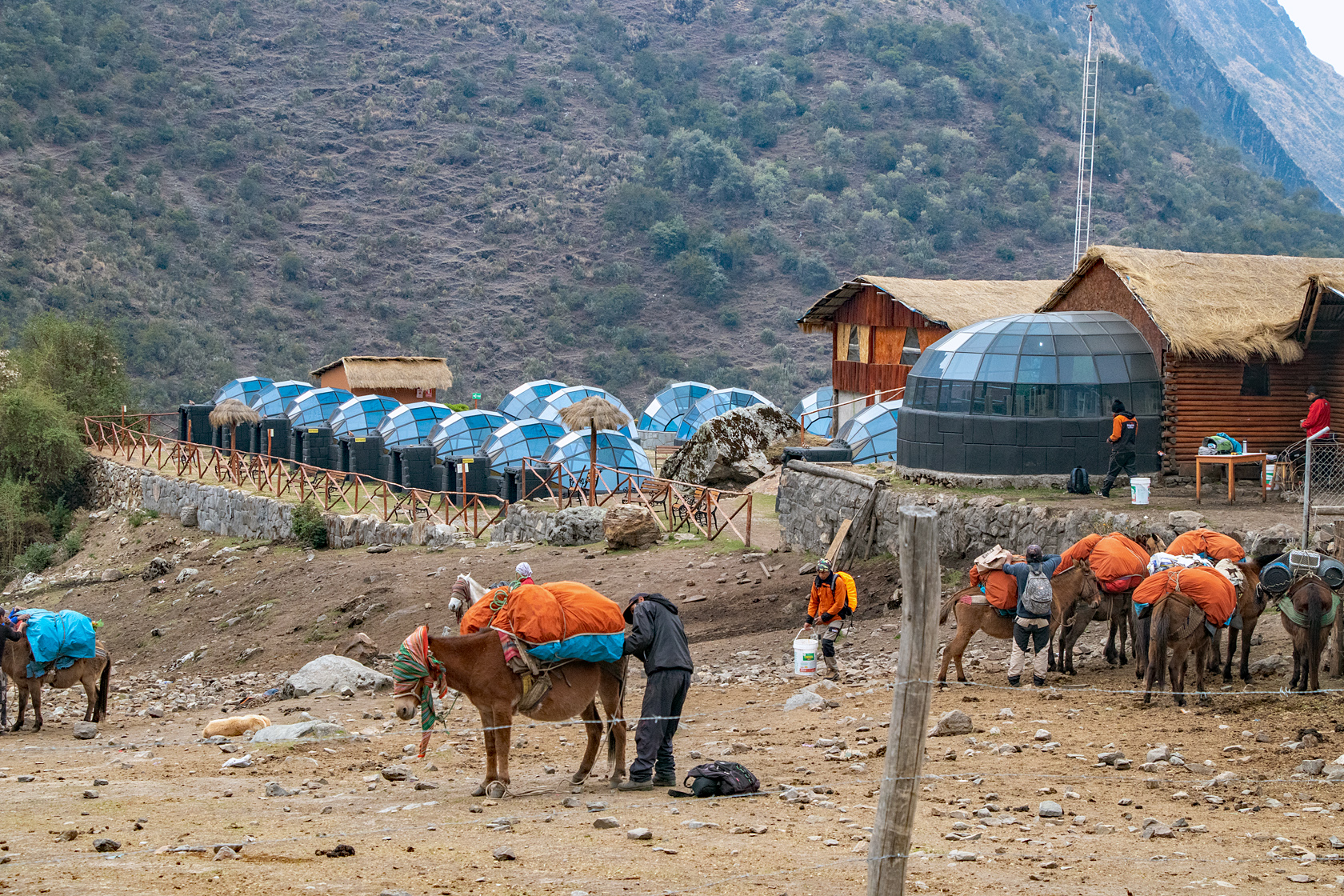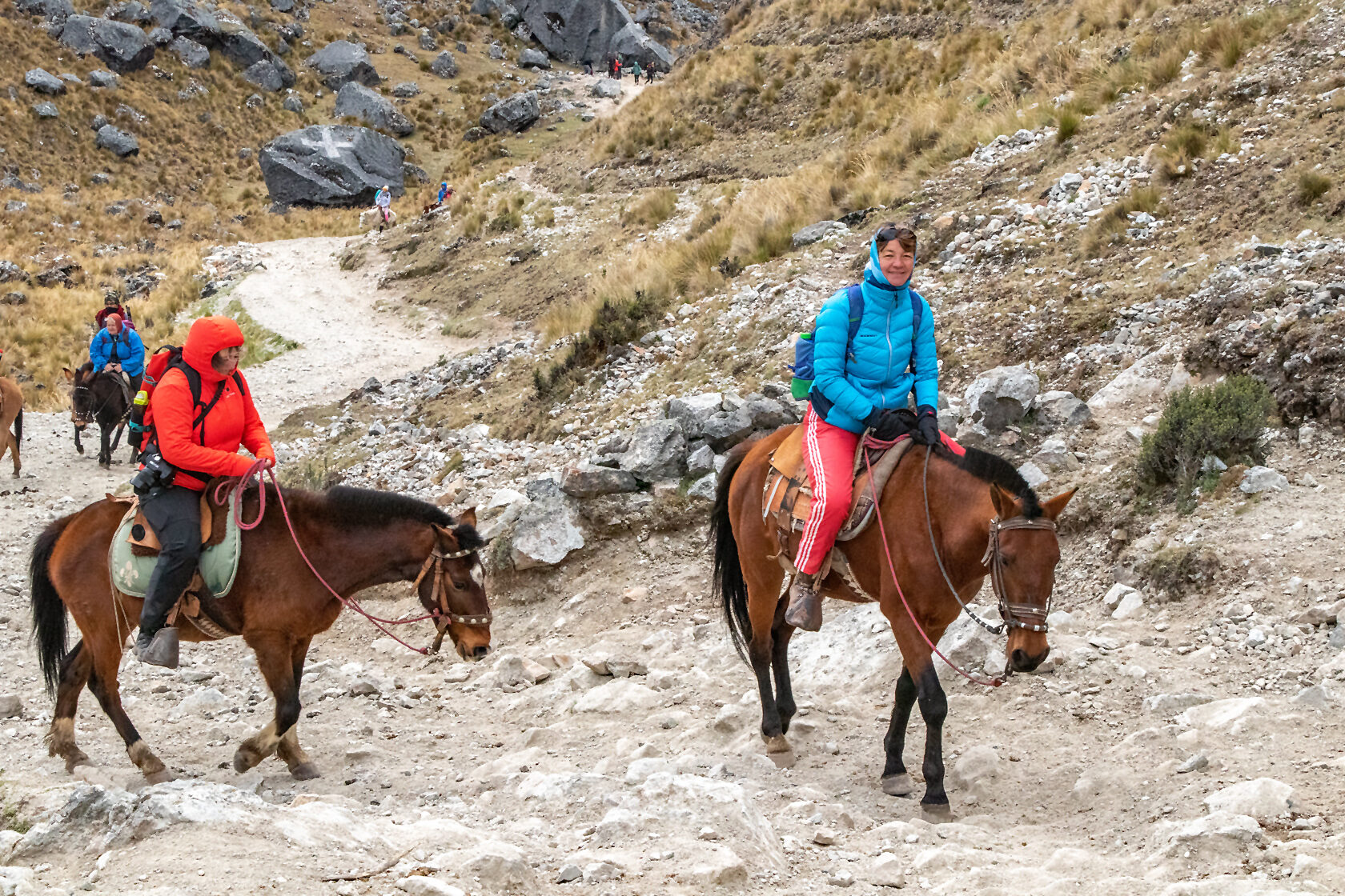 Das sind die besseren Unterkünfte. Da lassen sich schön Sterne beobachten..Erster Zwischenhalt. Vor dem steilen Anstieg.Der direktere Aufstieg der Wanderer ist entlang einer grossen Moräne.Mein Pferd wurde geführt. Eigentlich habe ich selbst Kontrolle über mein ‚Gefährt‘. So konnte ich dafür fotografieren.Wanderer, Transportpferde, Esel, Reisende auf Pferden. Am Salkantay ist was los.Gesunde Pferde, sehr gutes Saumzeug und der Sattel mit Griffmulde war für mich ideal.Es ist kühl auf dem Pferd, und trotzdem irgendwie angenehm.Es bereitet Freude auf den Pferden den Berg hoch zu kommen.Genaugenommen sind es 4630m.Der Salkantay ist 6’271m hoch.Nach dem Salkantay Pass geht es noch einige Studen bis auf etwa 3000m in das nächsten Zeltlager.Das Licht wechselt schnell. Und unter dem Zeitdruck ist der Genuss der Bergwanderung etwas eingeschränkt.Trotzdem versuchte ich von der schönen Natur einiges einzufangen.Immer wieder Überraschungen entlang des Weges.Nochmals der Salkantay.Ursula schenkte dem Buben eine Dose mit essbaren Inhalt. Die Mutter wies ihn an nicht alles gleich zu essen. 😉Die Bromeliae sind bereits vorüber. Trotzdem schön so viele an den Bäumen zu entdecken.Andenhimbeere?Der Fotoapparat kam mit den leuchtenden Farben dieser Pflanze nicht zurecht. Mit etwas Photoshop geht’s grad so.Nochmals ganz viele Bromelien.Viele Sträucher und Bäume sind voller Flechten. Ein Zeichen, dass die Luft hier gut ist.Packpferde und -Esel die unsere Zelte, die Küche und weiteres Material zum nächsten Lager bringen. Die Zelte werden von Mitarbeitern des lokalen Veranstalters aufgestellt. Einfach schön! Dieser Strauch hat feine bläuliche Blüten und unübersehbaren Dornen.