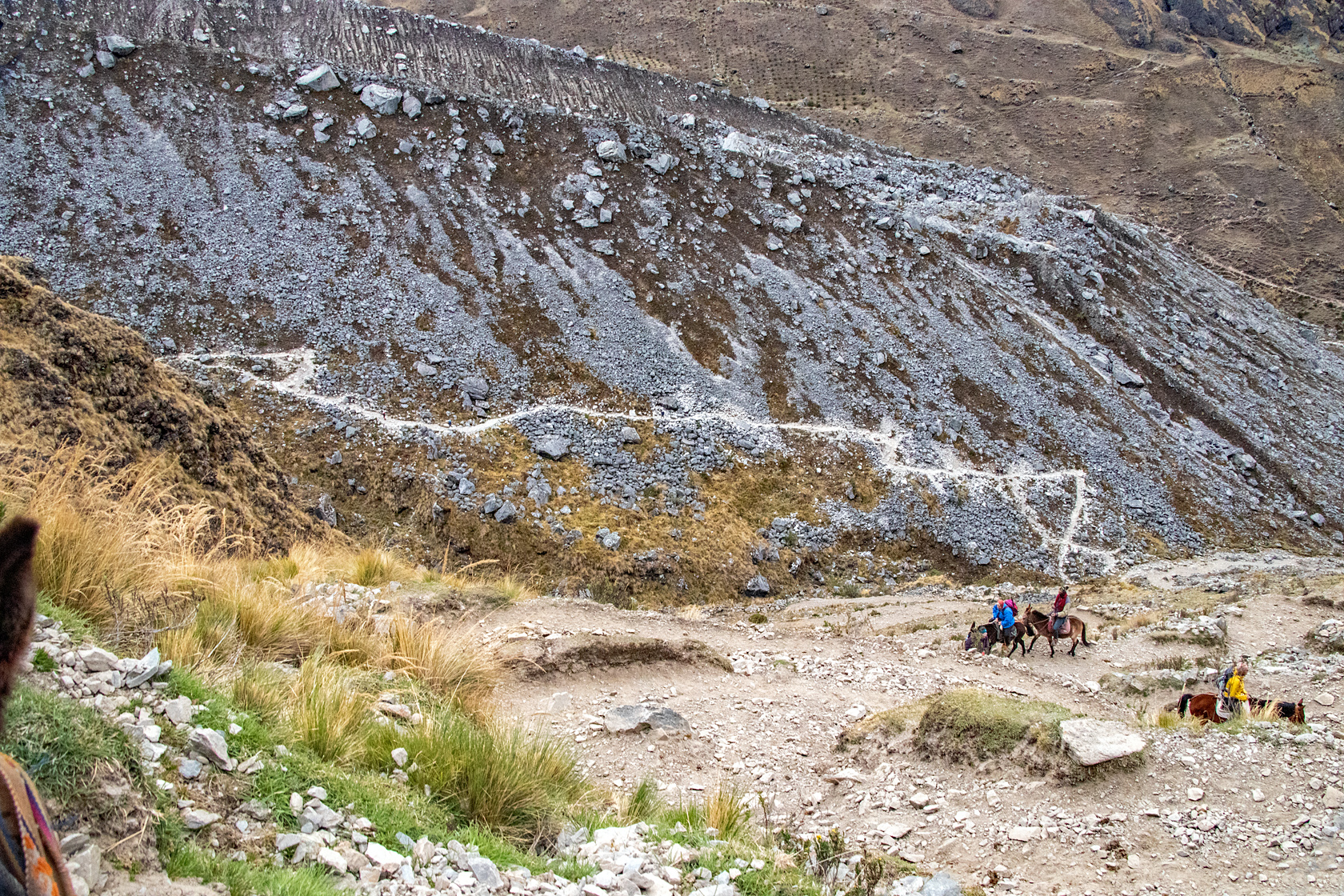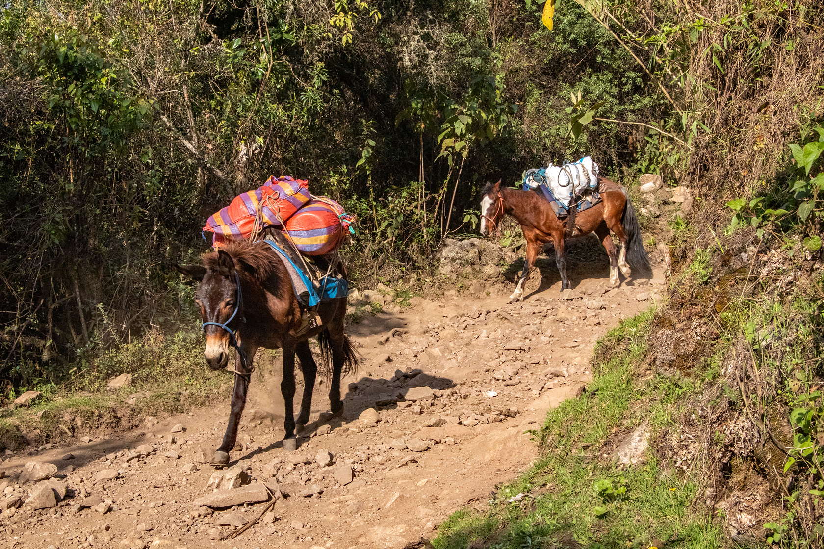 Nach diesem Foto stürze ich heftig und hatte in der Folge länger Schmerzen und rege mich sehr auf. Auch geht ein Teil der Fotoausrüstung, ein Filter und etwas am Gehäuse, drauf. Auch andere stürzten während der Wanderung, ich bin versucht zu sagen dem Rennen zum nächsten Lager, denn die Gruppe trennte sich weit auf, einige weit vorne – Streckenwanderer, jene die ein mittleres Tempo hatten und wie ich, da und dort eine Aufnahme machten und dann jene die einfach sich mehr Zeit liessen, sicheren Schrittes unterwegs sein wollten und doch einzelne auch stürzten. Was mit dem sehr ausgescharrten Weg, der ja von Wanderern wie auch den Transportpferden benutzt wird, zu tun hat (lose Steine unter einer dicken Schicht Staub). Diese Wanderung ist zu schön um einfach abgespult werden zu müssen. Etwas mehr Zeit um die Natur zu geniessen wäre sehr sinnvoll und für viele Reisende ein Bedürfnis.