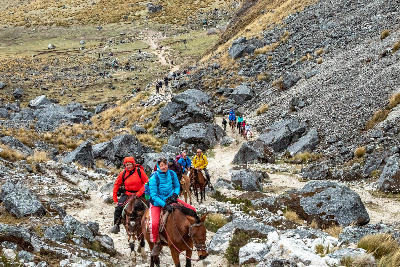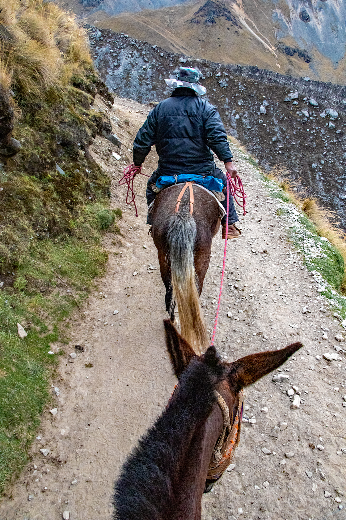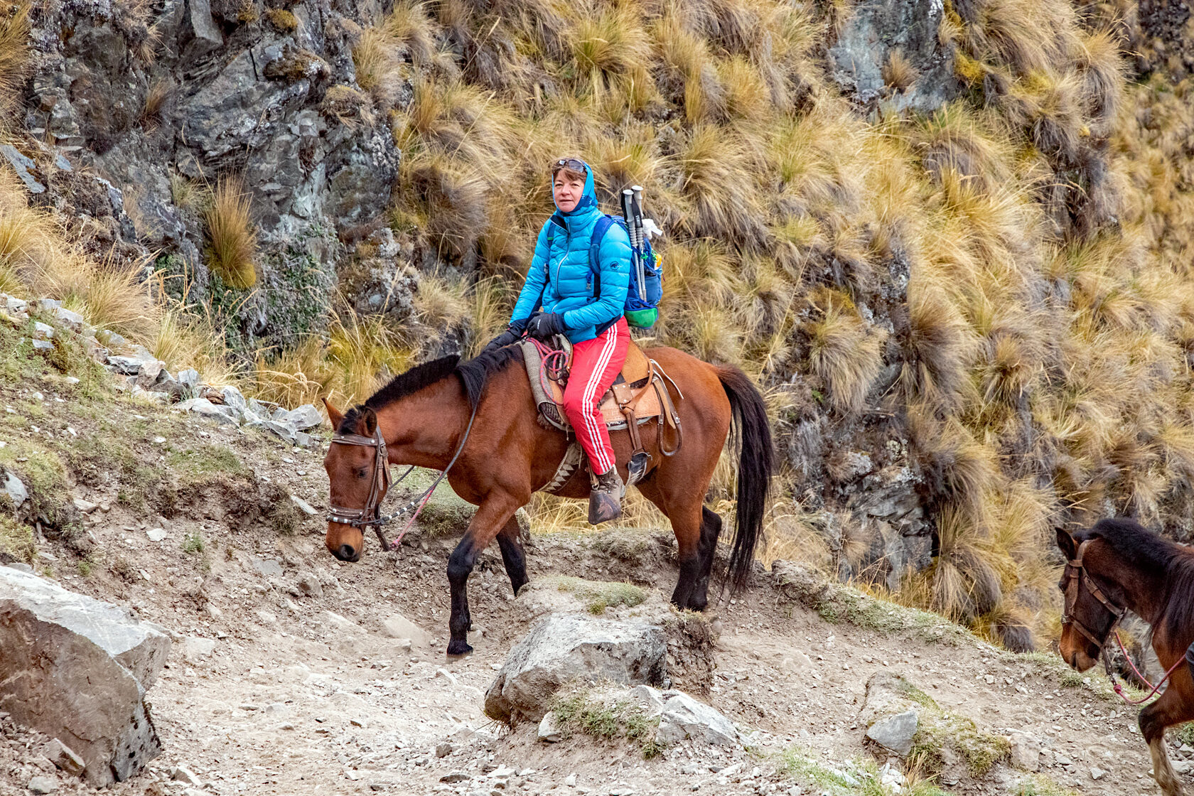 Von Soraybamba Aufstieg auf den Salkantay Pass. Vier Personen starten gleich mit den Pferden, ich steige in einer ersten Steigung auf und Ursula steigt vor dem steilen Anstieg auf. Gute, gesunde Pferde mit gutem Sattel. Auf dem Pass die üblichen Fotos und Abstieg auf eine Alp, Mittagessen und warten bis der Regen nachlässt. Danach weiter marschieren, fotografieren bis auf ca. 3000müM in Colcapampa.