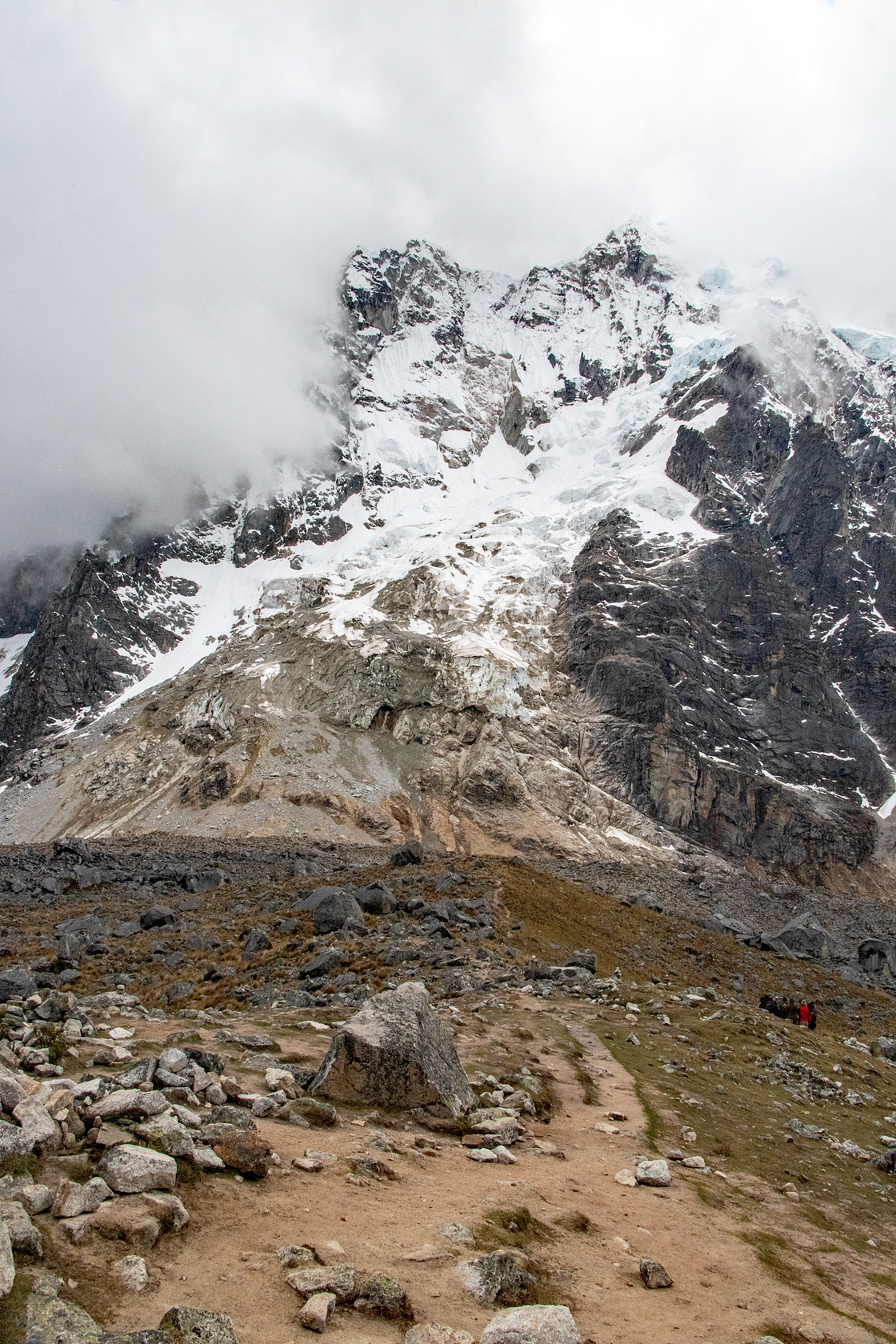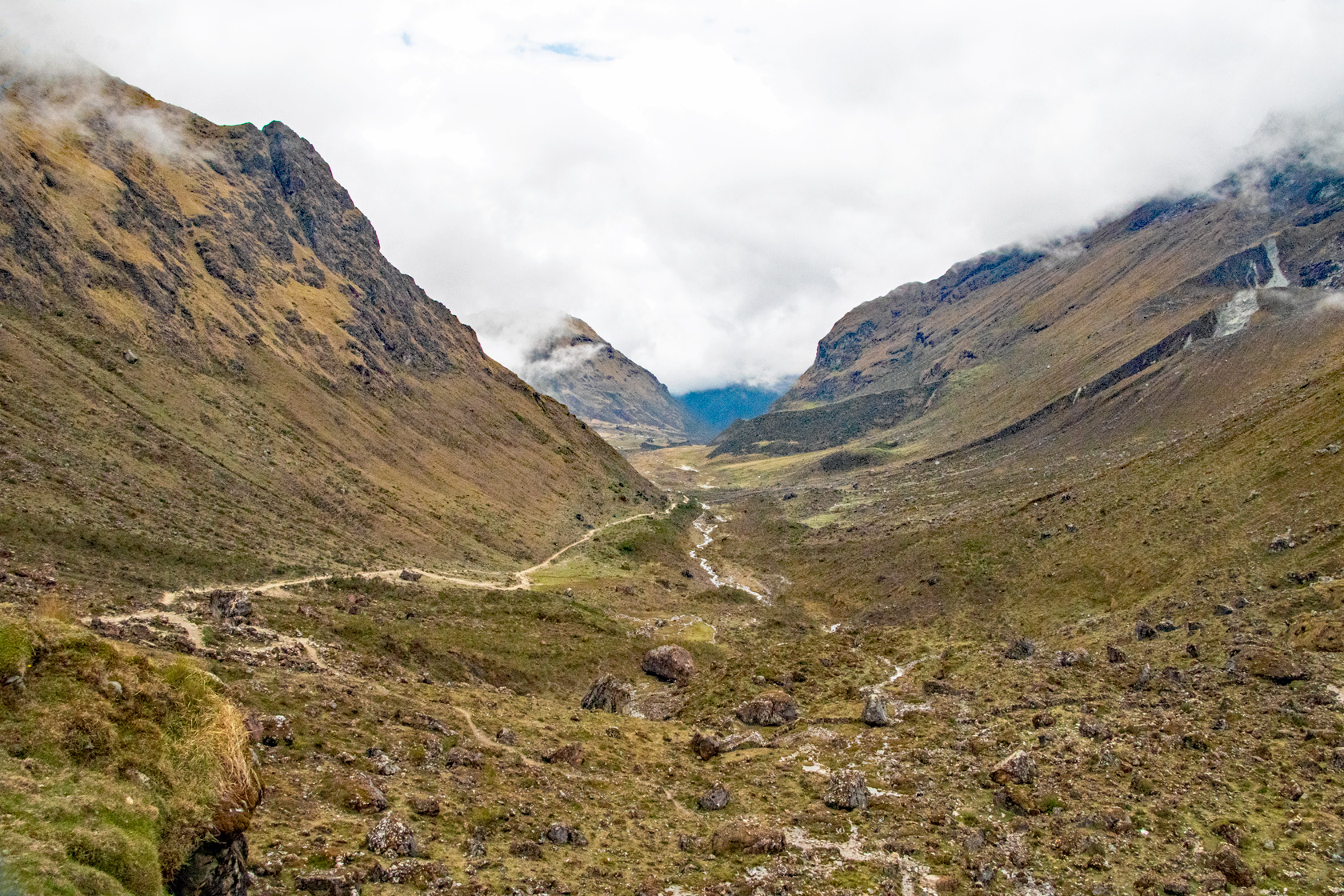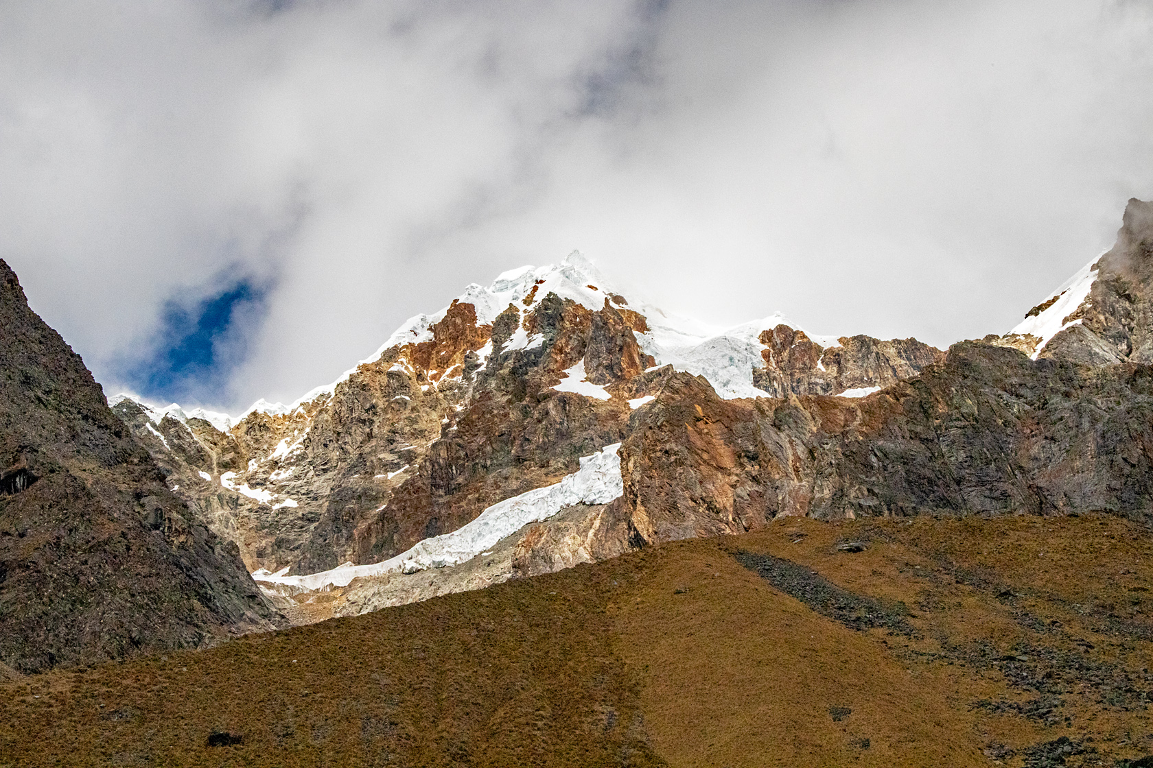 Von Soraybamba Aufstieg auf den Salkantay Pass. Vier Personen starten gleich mit den Pferden, ich steige in einer ersten Steigung auf und Ursula steigt vor dem steilen Anstieg auf. Gute, gesunde Pferde mit gutem Sattel. Auf dem Pass die üblichen Fotos und Abstieg auf eine Alp, Mittagessen und warten bis der Regen nachlässt. Danach weiter marschieren, fotografieren bis auf ca. 3000müM in Colcapampa.
