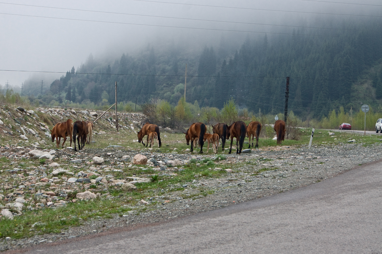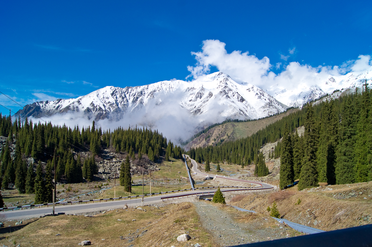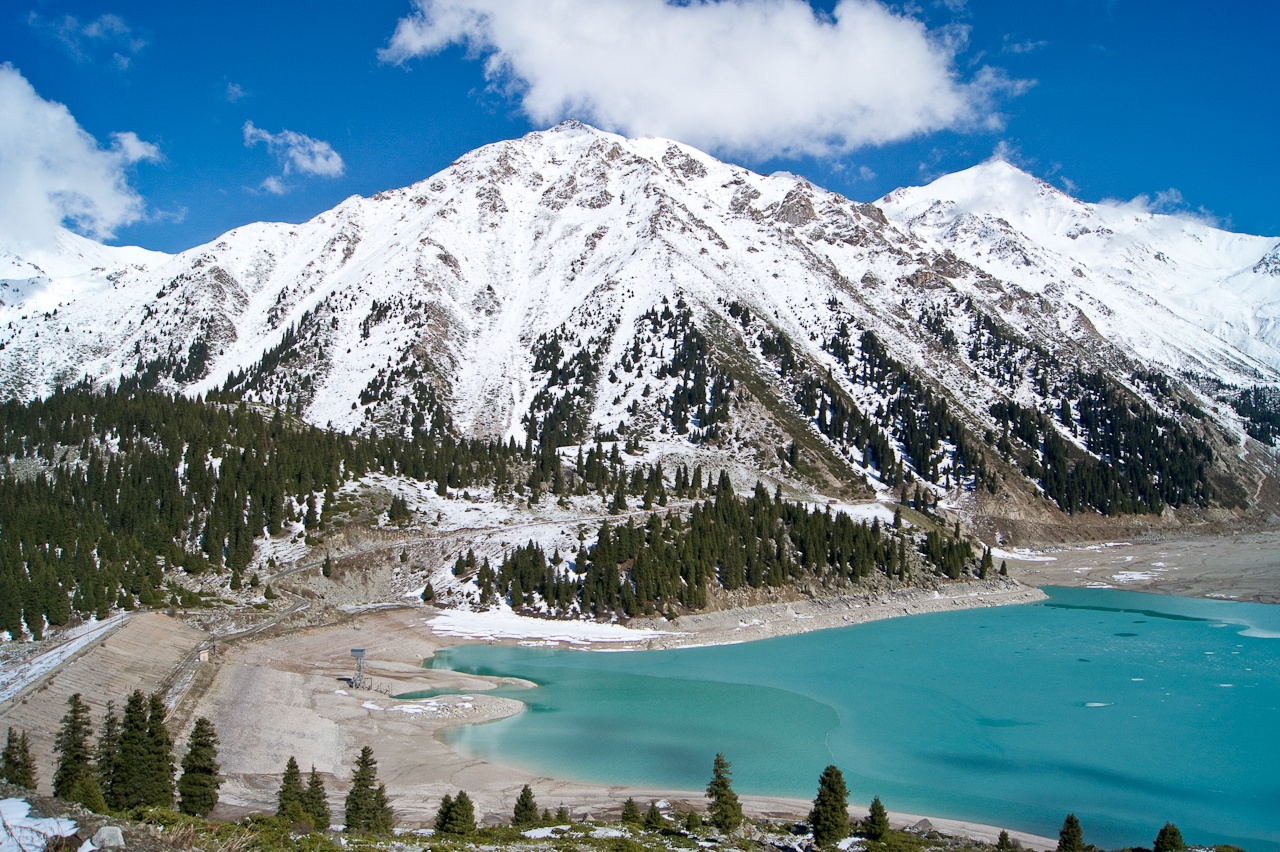Kaum aus der Stadt Almaty und in das Tal gefahren, stehen uneingezäunt Pferde auf und neben der Strasse. Völlig unbeirrt von den Fahrzeugen die hier durchfahren. Das werden wir auf der Reise noch mehrmals erleben. Glückliche und wie es scheint gesunde Tiere.Etwas weiter im Tal wird es dann rasch steiler und ich fühle mich wie in der Schweizer Alpen. Erstmals richtig sonnig seit meiner Ankunft – herrlich!Einfach nur schön!Die Tannen haben hier eine schlankere Form als bei uns und stehen dichter zusammen.Der Stausee ist noch noch mehrheitlich zugefroren und hat einen sehr tiefen Pegel. Es erinnert an unsere Stauseen, die auch nicht mehr so richtig voll werden.Die Staumauer ist breit aber nicht besonders hoch. Noch besser zu sehen, wie niedrig der Pegel ist.Weiter geht’s. Die Strasse ist sehr steil und kurvig. Mir passt das – Saule stört es glücklicherweise nicht.Schade, keine Weiterfahrt! Gut – weiter oben wäre, wegen dem Schnee, eh bei 3000 Metern die Weiterfahrt unmöglich geworden. Sieht trotzdem sehr schön aus. Noch richtig viel Schnee hier oben, knapp über dem Tienschan Observatorium auf 2810 Meter.