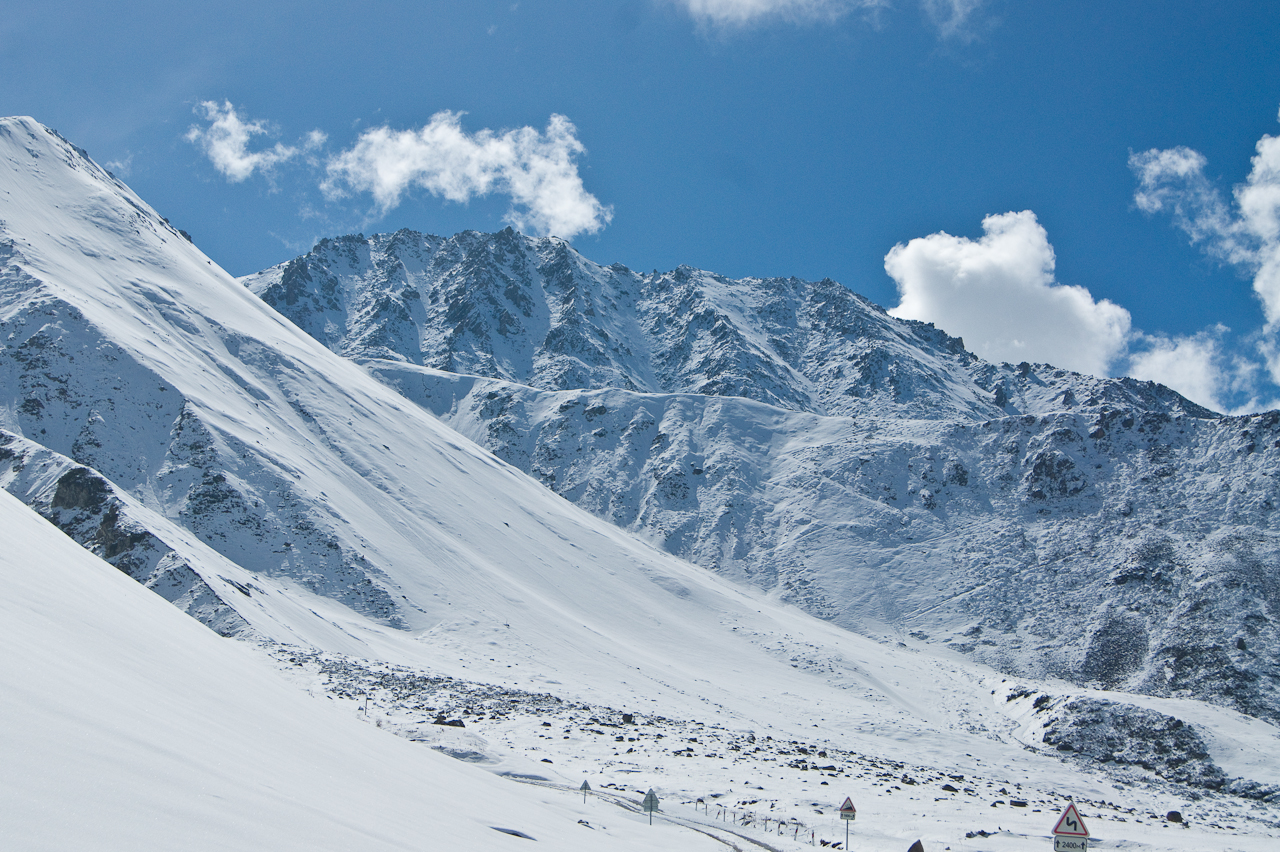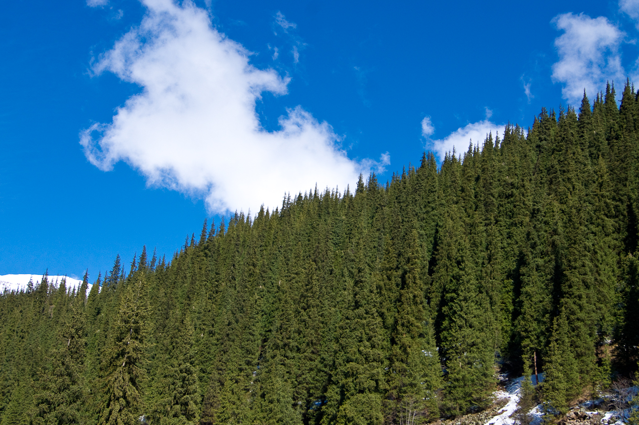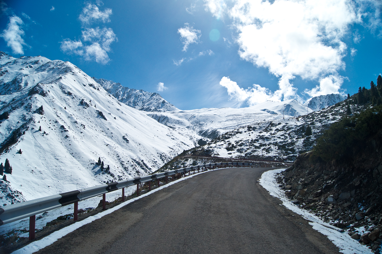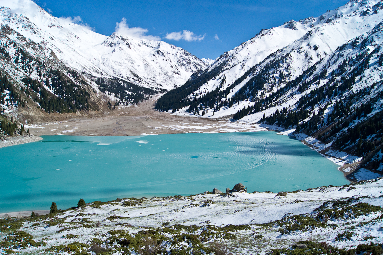 Kaum aus der Stadt Almaty und in das Tal gefahren, stehen uneingezäunt Pferde auf und neben der Strasse. Völlig unbeirrt von den Fahrzeugen die hier durchfahren. Das werden wir auf der Reise noch mehrmals erleben. Glückliche und wie es scheint gesunde Tiere.Etwas weiter im Tal wird es dann rasch steiler und ich fühle mich wie in der Schweizer Alpen. Erstmals richtig sonnig seit meiner Ankunft – herrlich!Einfach nur schön!Die Tannen haben hier eine schlankere Form als bei uns und stehen dichter zusammen.Der Stausee ist noch noch mehrheitlich zugefroren und hat einen sehr tiefen Pegel. Es erinnert an unsere Stauseen, die auch nicht mehr so richtig voll werden.Die Staumauer ist breit aber nicht besonders hoch. Noch besser zu sehen, wie niedrig der Pegel ist.Weiter geht’s. Die Strasse ist sehr steil und kurvig. Mir passt das – Saule stört es glücklicherweise nicht.Schade, keine Weiterfahrt! Gut – weiter oben wäre, wegen dem Schnee, eh bei 3000 Metern die Weiterfahrt unmöglich geworden. Sieht trotzdem sehr schön aus. Noch richtig viel Schnee hier oben, knapp über dem Tienschan Observatorium auf 2810 Meter.