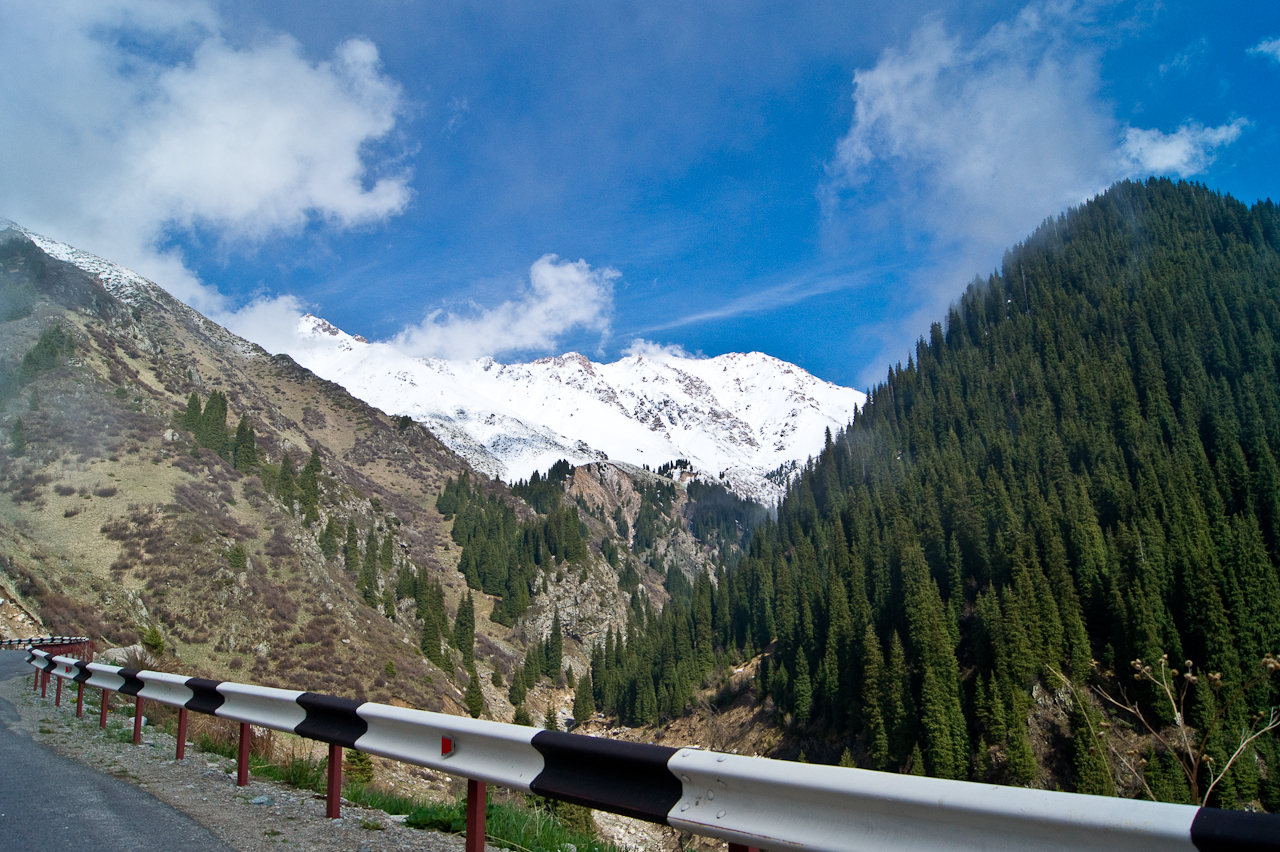 An diesem Tag fuhren wir etwas westlich der Stadt in die Berge an den grossen Stausee von Almaty. Dort versuchten wir auf einer kleinen Strasse auf 3000 Meter hoch zu fahren. Beim Observatorium wurden wir vom Militär angehalten. Der Wachmann fragte mich etwas auf Russisch was ich natürlich nicht verstand, weshalb dann Saule mit ihm sprach. Er funkte mit dem Kommandant was er mit uns tun müsse. Nun, wir mussten leider wieder runterfahren, da der obere Abschnitt gerade vom Militär für Übungen besetzt und eine Weiterfahrt nicht erlaubt sei.