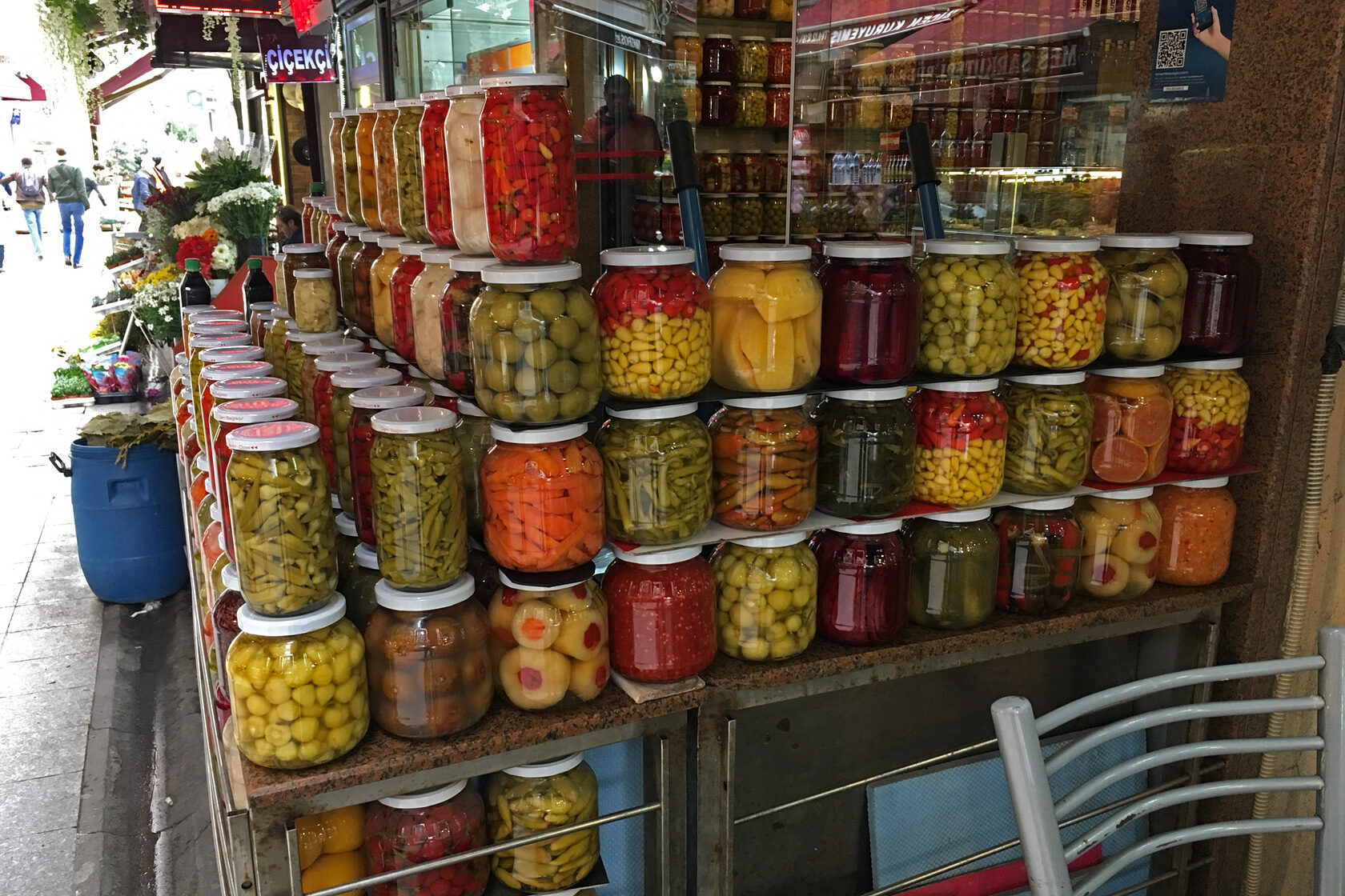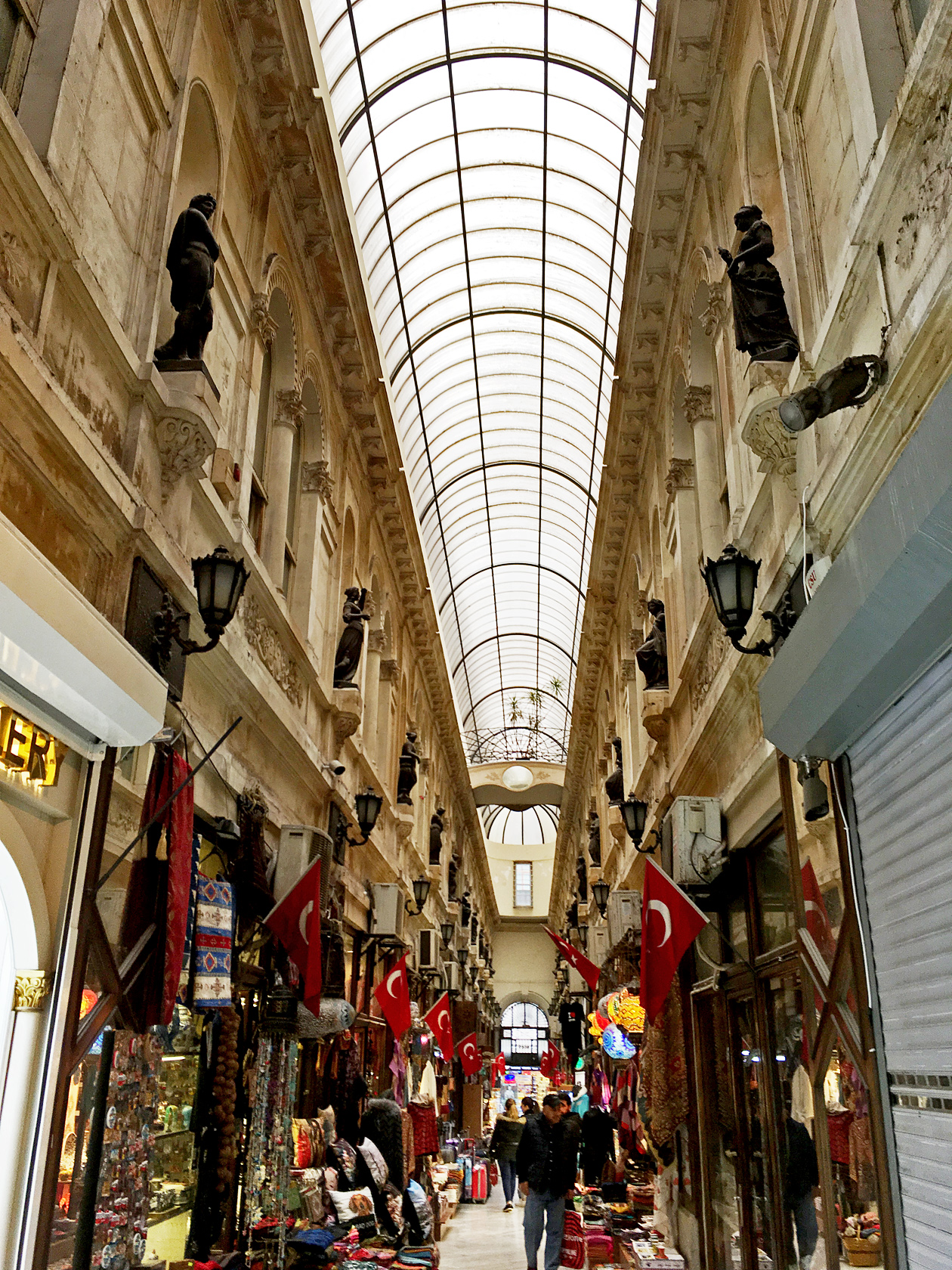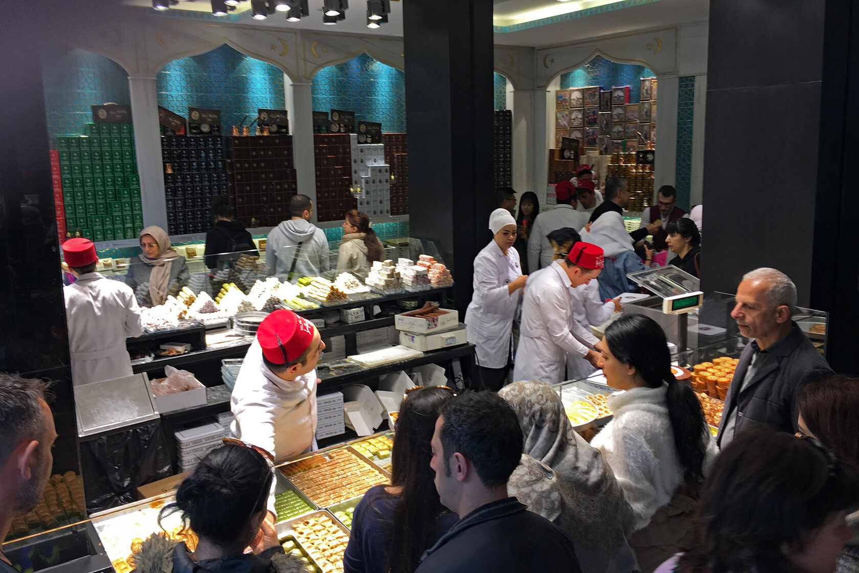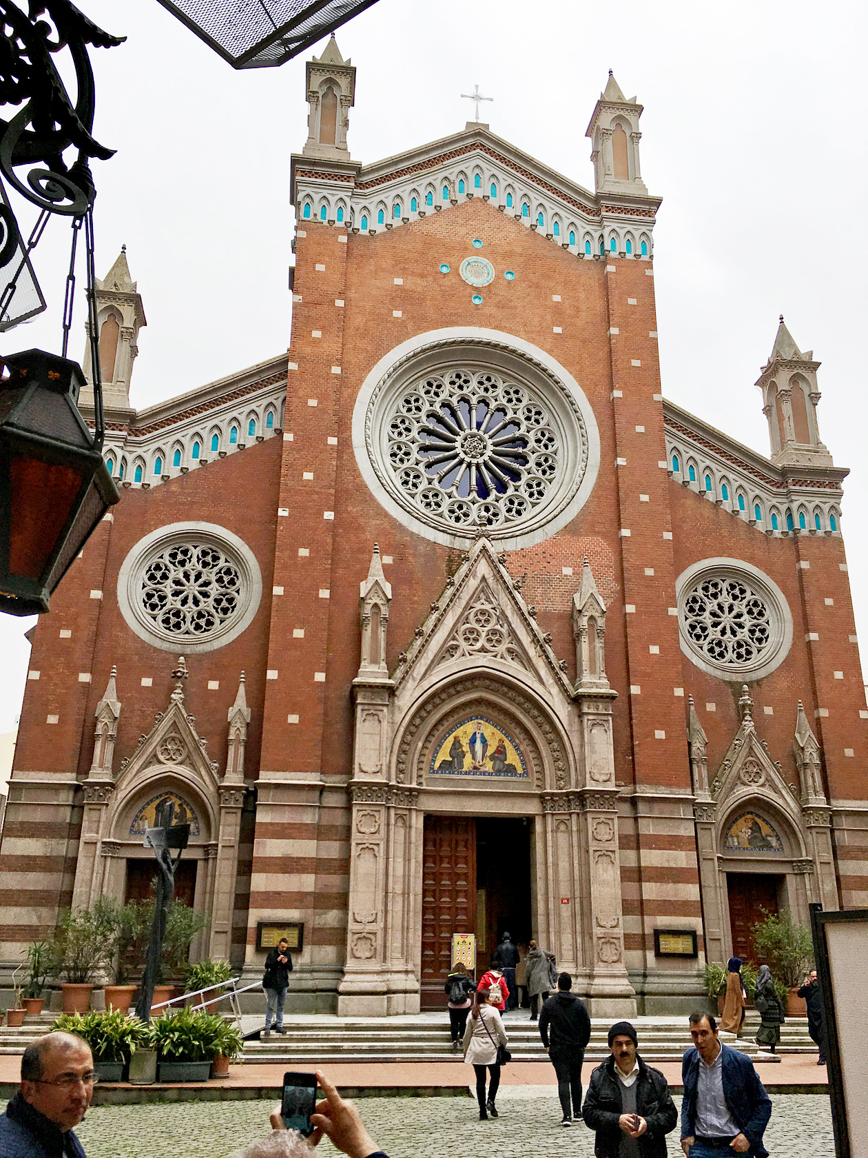 Beginnen wir mit einem historischen Gebäude, einer reich verzierten Kirche.Katholische Kirche Sankta Maria DraperisEinige Blöcke weiter, die nächste Katholische Kirche, die Basilika St. AntoniusCiçek Pasaji. Ein Geschäftsgebäude mit Restaurants und stilistisch irgendwo in Anfang des letzten Jahrhunderts.In der Ciçek Pasaji.Schon fast am Taksim Platz. Da zieht es uns magisch zu diesem Geschäft. Süssigkeiten und Schokolade in Perfektion.Vielleicht kein Läderach und kein Sprüngli aber doch sehr gehoben. Wir hatten es uns verkniffen etwas zu kaufen. Jdoch hätten wir trotzdem etwas kaufen sollen, nur es hatte so viele Leute.Der Taksim Platz. In aller Welt bekannt durch die Demonstration in 2013 die mit aller Härte nieder gerungen wurde.Der Blick zur Basilika St. Antonius.Ein ‚gepanzertes‘ Fahrzeug. Die Diensthabenden Sicherheitsleute wollten mir weiss machen, dass dies ein in der Türkei hergestelltes Fahrzeug sei. Ich widersprach höflich und meinte dass dies ein Land Rover 110 aus England sei und lediglich technisch modifiziert sei. Klar erkennbar an den Kotflügeln mit den Lichtern vorne und hinten.Ganz klar ein Land Rover 110 modifiziert durch Otokar. Ein türkisches Unternehmen, das neben Bussen und LKWs auch Militärische Fahrzeuge herstellt.Zurück zu Kulinarischem. Tafelschokolade – reihenweise. Mmmmh!Beim Kaffee trinken im 1. Stock nochmals das alte Tram aus den 20er Jahren aufgenommen. Gut zu sehen, dass auch sehr viele Leute, vorallem Türken auf dieser Strasse gehen.Technik der 20er Jahre, jedoch in den 50ern in Deutschland gebaut. Alle Mal schön anzuschauen.Statt der ‚Tünel‘-Bahn geht es zu Fuss runter. Ein toller Fruchtstand der gute Säfte zubereitet.Migros? Nein das ist nicht der orangene Riese aus der Schweiz, jedoch hat sich ein ähnliches Geschäftsmodel in den 60er Jahren entwickelt und es knüpft nach wie vor an das Geschäftsmodell der Migros Genossenschaft. Hierzu auch die Notiz in Kasachstan unter Ramstore lesen.Das Logo ist klar anders als in der Schweiz.Wenn das Logo anders wäre…Gegenüber ein Geschäft das sich ans Eingemachte macht… Alles mögliche ist diesen Gläsern konserviert. Keine Ahnung wie das schmeckt, ich denke jedoch dass die Türken schon wissen was gut schmeckt.