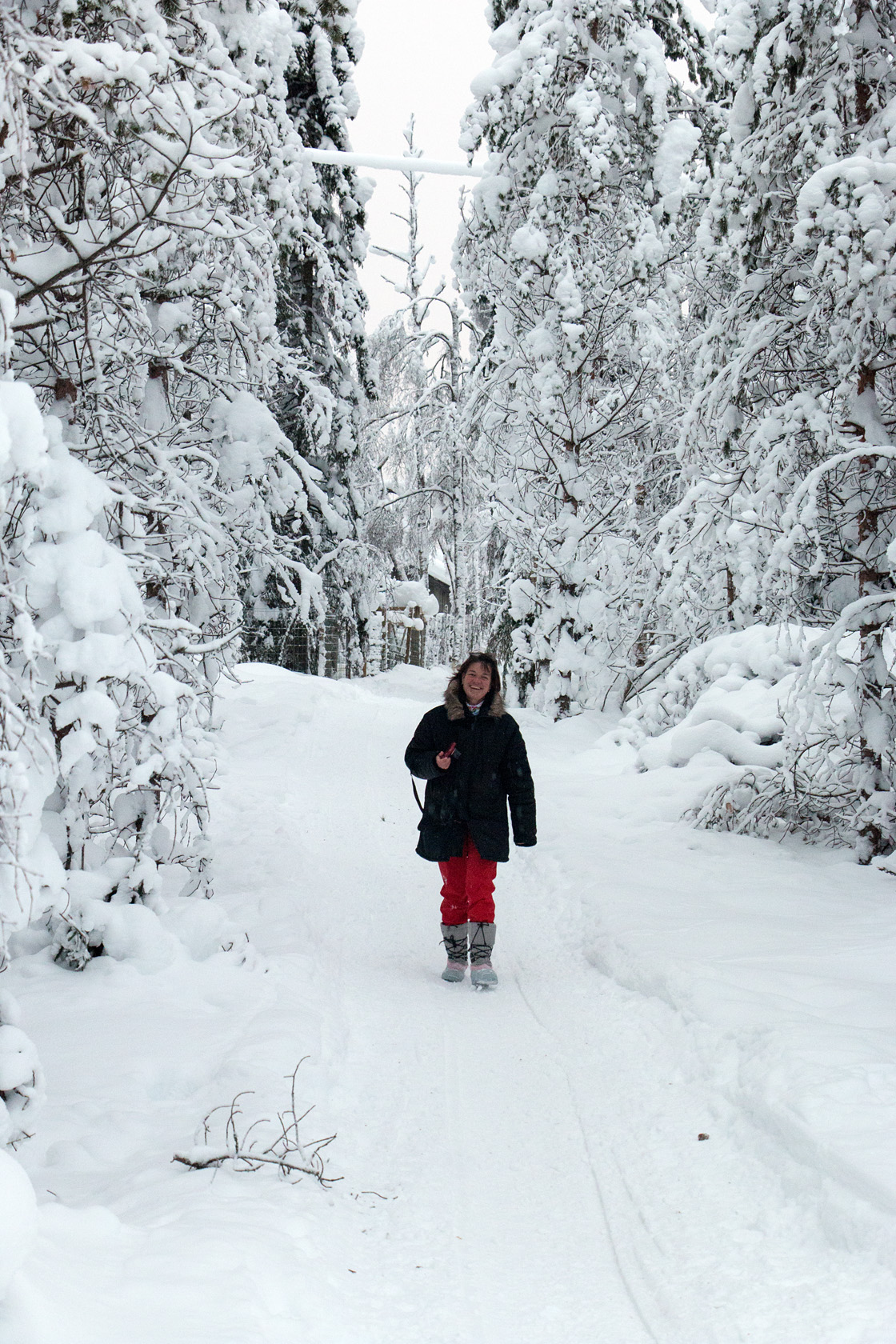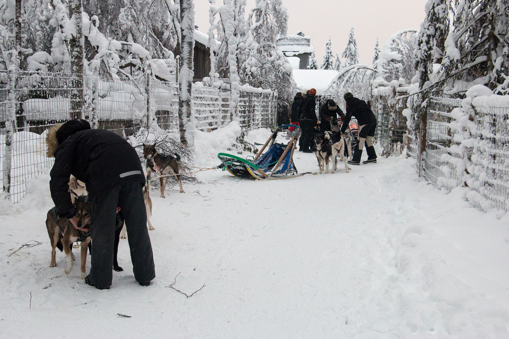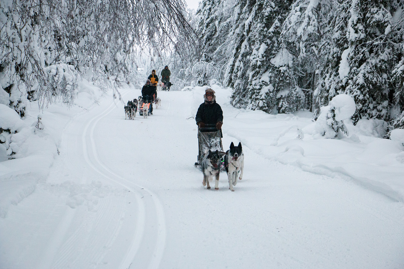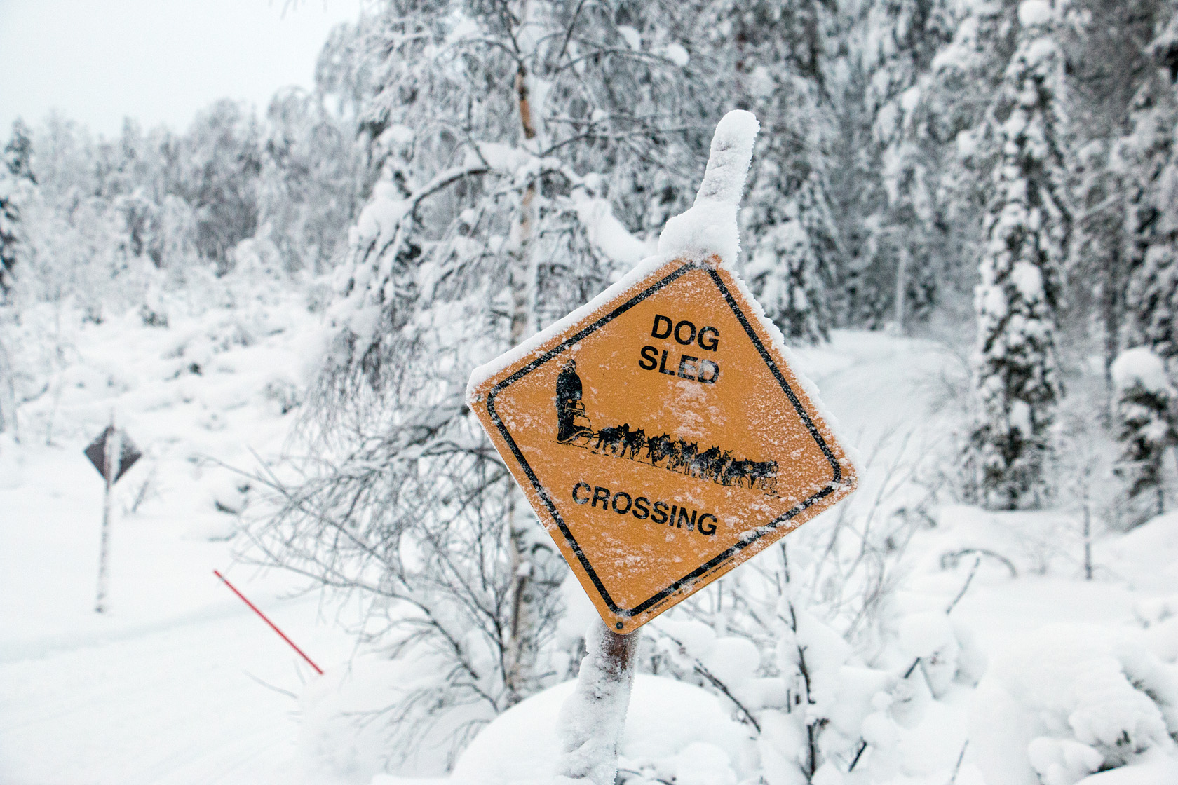 Vorbereitungen vor dem Hundeschlitten Fahren sind hektisch, laut und auch für das Personal der Unterkunft nicht ganz einfach zu bewältigen.Die Hunde werden extrem unruhig, es wird gut sichtbar weil sie zittern und völlig aufgeregt aufspringen oder bereits an den Schlitten reissen.Unsereins ist zuerst mal zu Fuss unterwegs. Wir geniessen den herrlichen Wintertag, den vielen Schnee.So macht es Freude! 😀Hinweisschilder entlang der Wege und…dort wo sich Hundeschlitten, Wanderer, Langläufer und Schneemobile kreuzen.Einzelne Bachläufe sind nicht zugefroren. Zu dieser Stelle gibt es noch eine Episode…Die erste Gruppe kommt von ihrer Hundeschlitten Tour zurück.Wir geniessen noch etwas die Ruhe abseits der Unterkunft.Von der Last der Winter geformt. Wir kennen das bei uns in den Alpen.Endlos scheint der Weg.